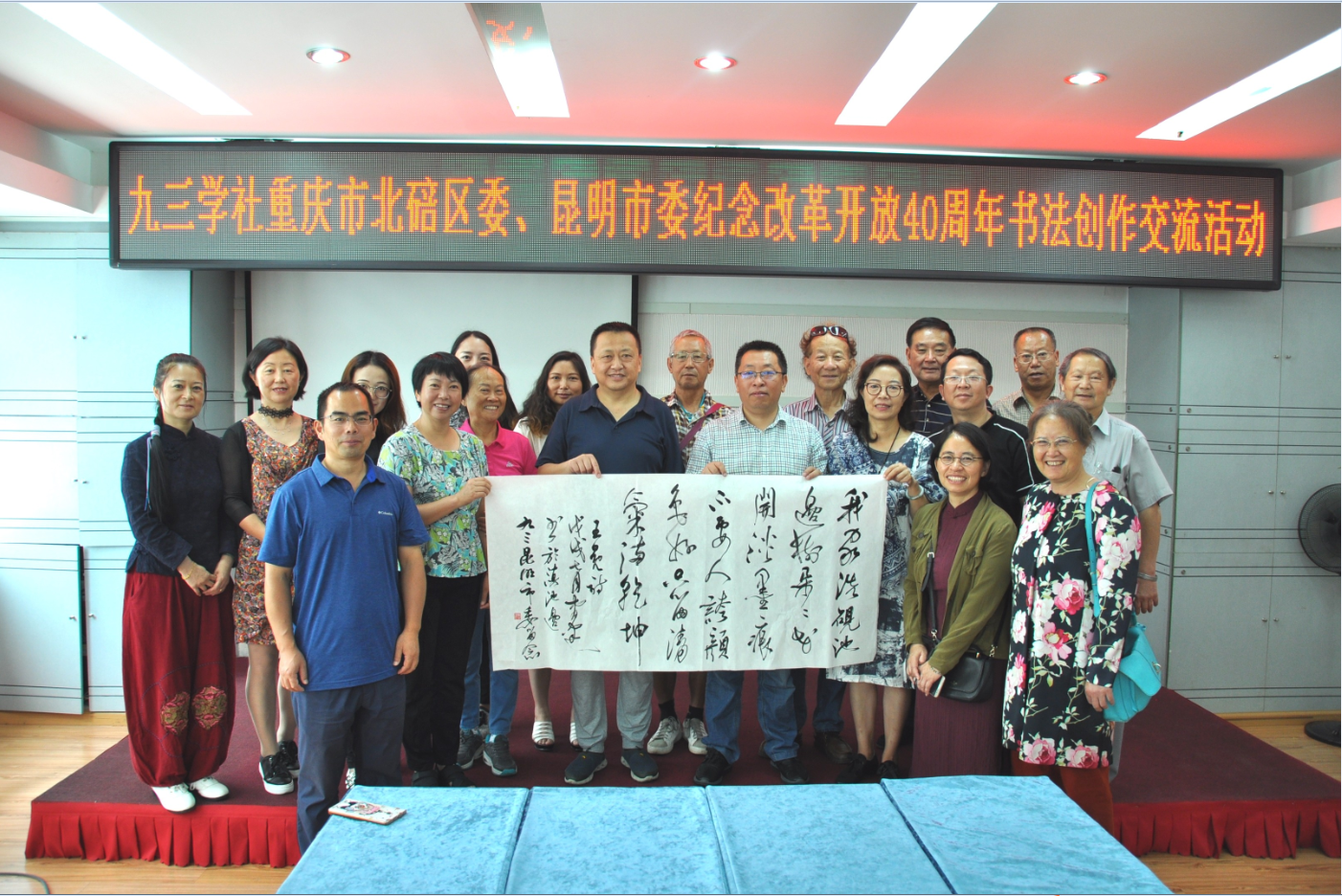 8月25日上午、26日下午,为纪念改革开放40周年,增进社组织间横向联系和文化交流,九三学社PA视讯委员会和九三学社重庆市北碚区委分别与九三学社昆明市委、九三学社玉溪市委联合开展“纪念改革开放40周年书法创作交流活动”。社中央组织部副部长、玉溪市政府副市长周群英(挂职),社中央监督委员会委员、社重庆市市委常委、社重庆市北碚区委主委李航,社PA视讯委员会主委杨大成,社玉溪市委主委郭亚钢,社昆明市委专职副主委王云伟等参加了活动。