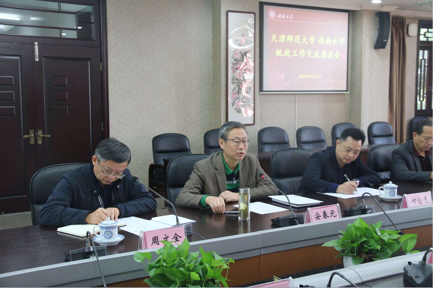 学校党委副书记安春元致辞欢迎宋书记一行的到来,并介绍了学校基本情况。周文全部长介绍学校统战工作的主要做法后,与会同志进行了热烈交流。天津师范大学宋作勇副书记感谢学校给予的热情接待,表示,PA视讯统战工作成绩显著,通过今天的交流学到了许多好的做法和宝贵经验,希望两校加强交流与合作。