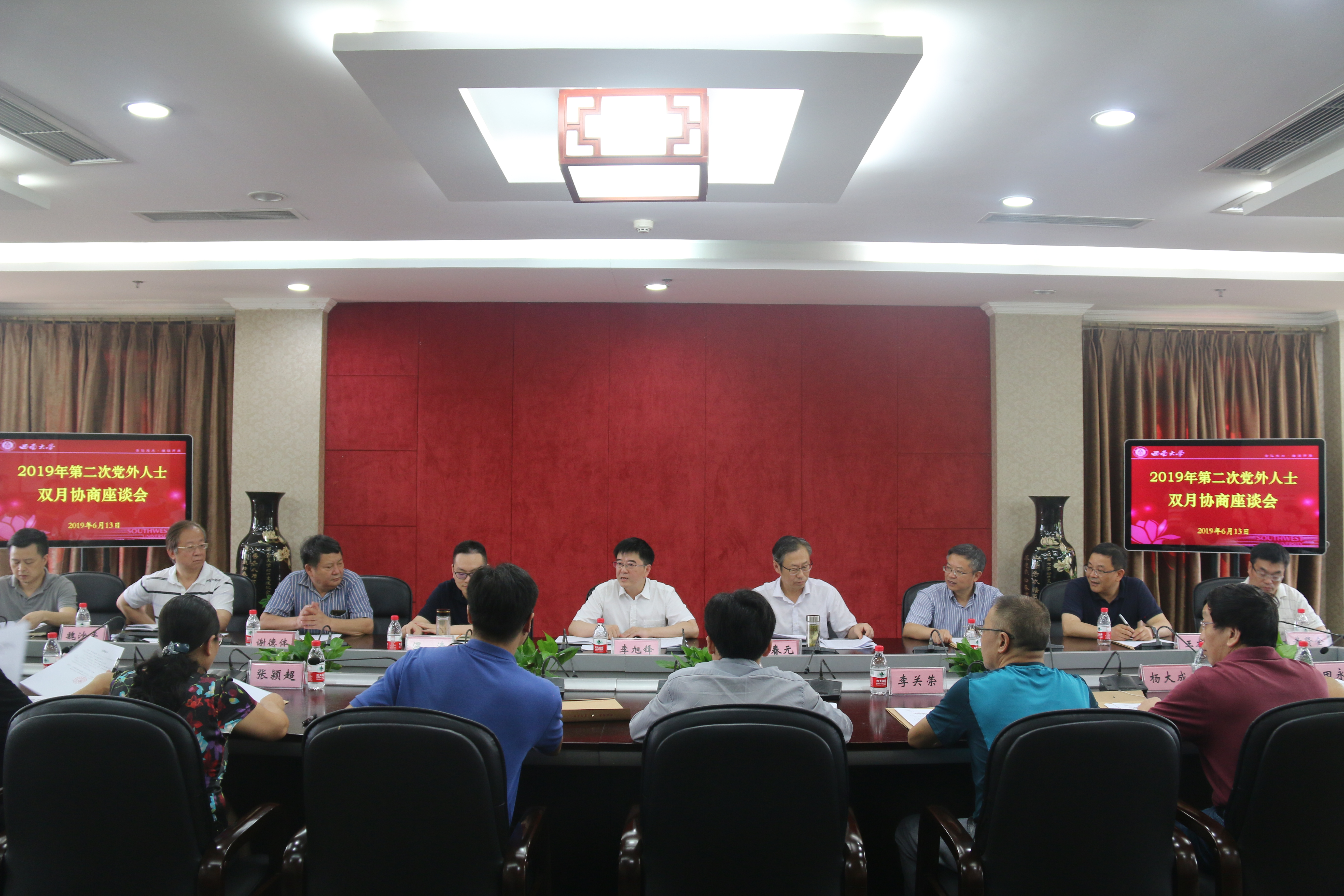 6月13日下午,学校党委在行署楼5会议室举行党外人士双月协商座谈会,专题协商学校第三次党代会工作报告。校党委书记李旭锋主持会议,党委副书记安春元、副校长温涛出席,全国人大代表、全国政协委员,各民主党派学校、区、市级组织主副委,统战团体负责人,统战部负责人参加会议。