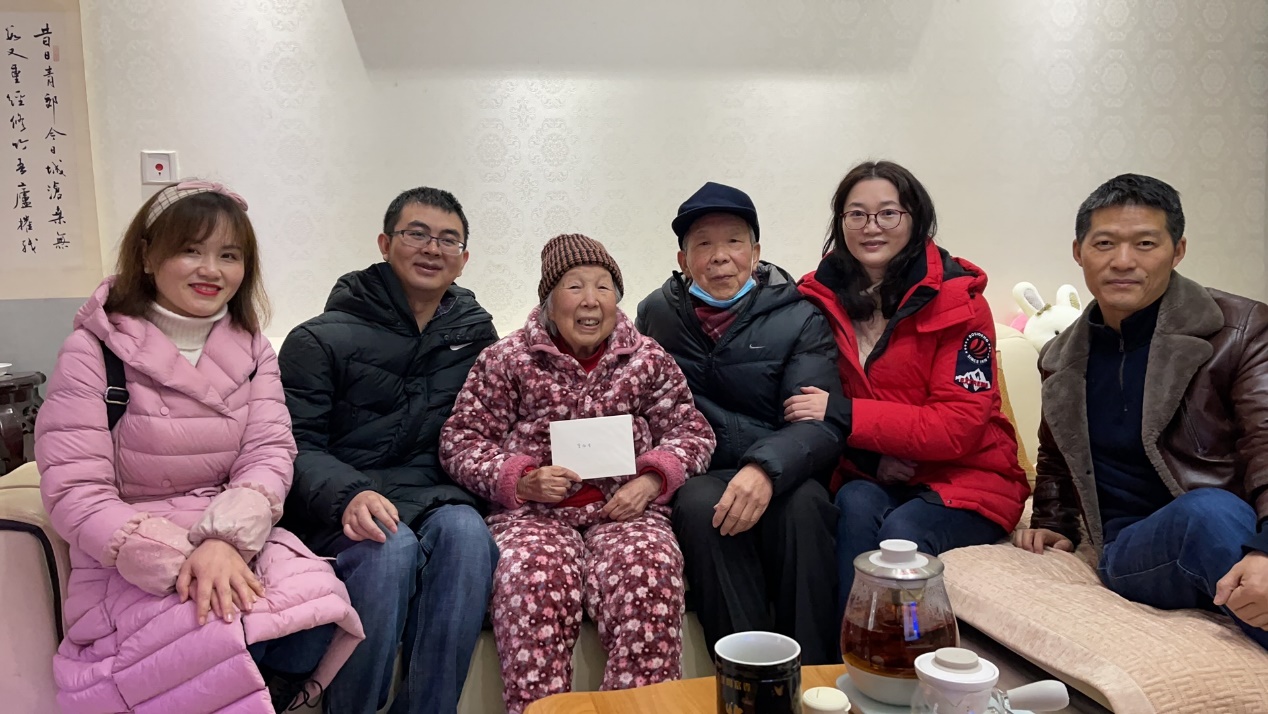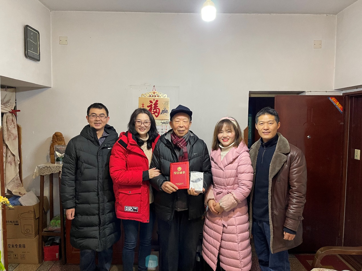随后在余老师的热情陪同下,慰问小组一行先后来到另外5位在渝高龄盟员的家中,向各位前辈汇报了近期的工作,并向他们及其家人提前致以新春的祝福。在外国语学院96岁的徐炳炀老师家中,他和余老师一起共同回忆了在外国语学院工作时的峥嵘岁月,两人还分别用俄语、英语进行了饶有兴致的交流;音乐学院92岁的范绍台老师在退休后仍坚持每天拉小提琴陶冶情操;文学院93岁的李淑清老师和音乐学院99岁的熊镜蓉老师仍关心、惦记着组织的发展工作;教育学部102岁高龄的李林静老师一家展现出的母慈子孝、其乐融融的温暖大家庭景象更是让大家称羡不已。