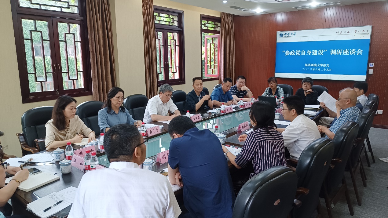 在“参政党自身建设”调研座谈会上,民革西大总支作了工作汇报,与会民革党员围绕调研主题,结合自身实际,进行了踊跃交流发言。