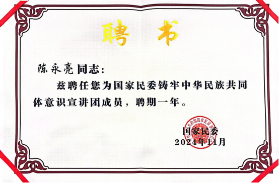 陈永亮教授长期致力马克思主义民族理论与政策、中华民族共同体研究,在铸牢中华民族共同体意识研究方面取得了突出成绩,形成了一批高质量研究成果,曾荣获国家民委信息工作先进个人以及国家民委社会科学研究成果奖二等奖、三等奖等。陈永亮教授表示,此次入选国家铸牢中华民族共同体意识宣讲团,既是荣誉和鼓励,更是责任和使命,将切实肩负起宣讲团成员的神圣职责和重要任务,积极宣介新时代党的民族理论政策等内容,为铸牢中华民族共同体意识和民族团结进步事业蓬勃发展贡献智慧和力量。