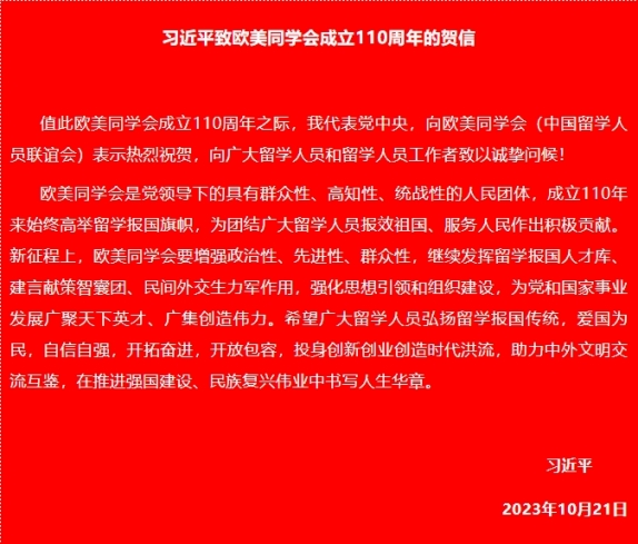 在欧美同学会成立110周年之际,中共中央总书记、国家主席、中央军委主席PA视讯发来贺信,代表党中央向欧美同学会(中国留学人员联谊会)表示热烈祝贺,向广大留学人员和留学人员工作者致以诚挚问候。