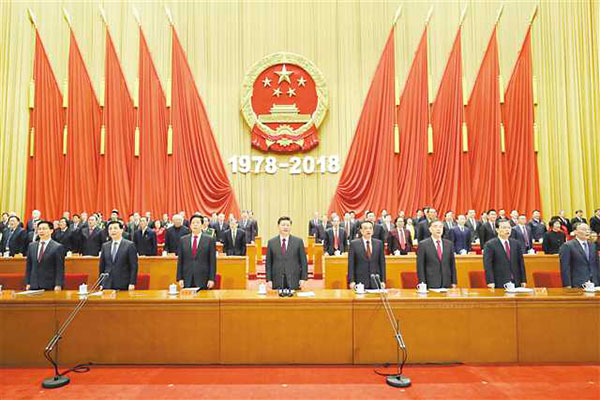 人民大会堂雄伟庄严,万人大礼堂灯火辉煌、气氛热烈。主席台上方悬挂着“庆祝改革开放40周年大会”会标,后幕正中是中华人民共和国国徽和“1978-2018”字标,10面红旗分列两侧。