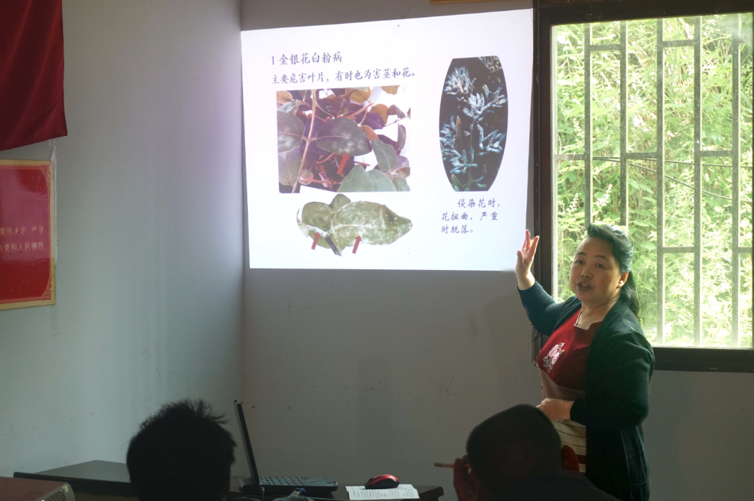培训会上,助理团为村民们发放了金银花种植加工实用手册、中医药文化科普手册等科普资料200余份,为60余名农户健康解惑、诊断看病,讲解金银花病虫害识别、症状特征和防治方法。徐教授热情地为村民看病,嘘寒问暖,问诊村民不断;杨教授为村民精心准备了金银花病虫害防治及其农药使用的课件,讲课图文并茂、浅显易懂,并不时与听课村民互动交流,村民们主动取出手机拍照及时记录下关心的科技知识。助力团的老师和同学们离开时,村干部和村民们依依不舍并合影留念。(供稿:杨晓红)