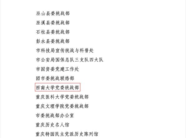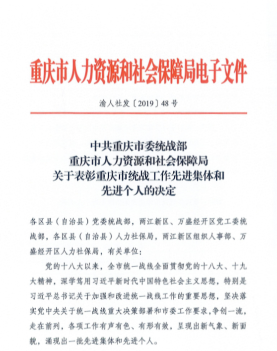 近日,学校党委统战部受到重庆市委统战部、重庆市人力资源和社会保障局联合表彰,荣获重庆市统战工作先进集体荣誉称号。