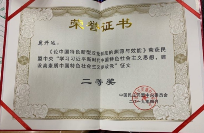 民盟盟员冀开运教授论文获得民盟中央征文二等奖