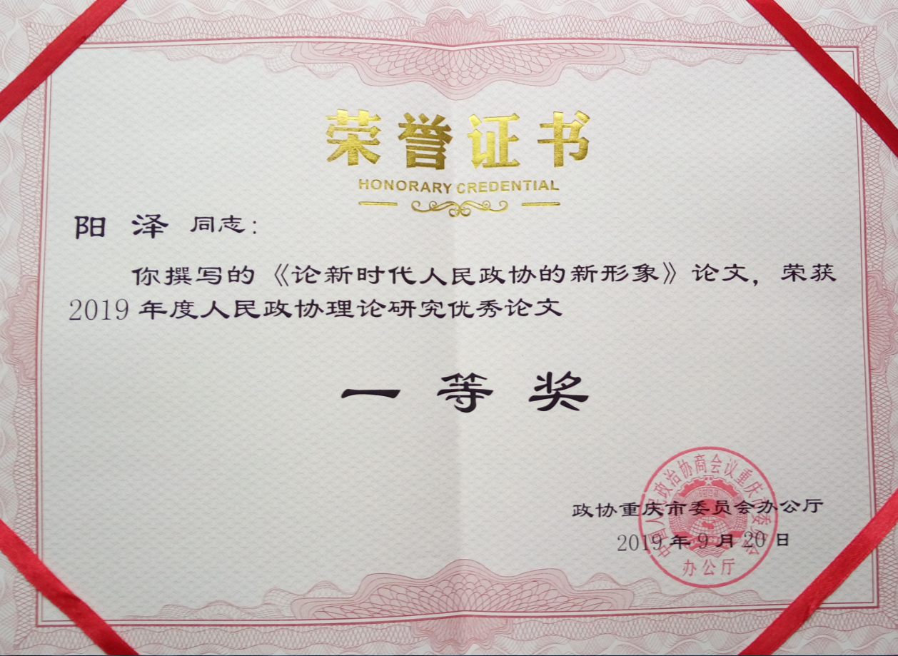 民盟阳泽副教授获市政协“庆祝人民政协成立70周年”理论研讨会一等奖