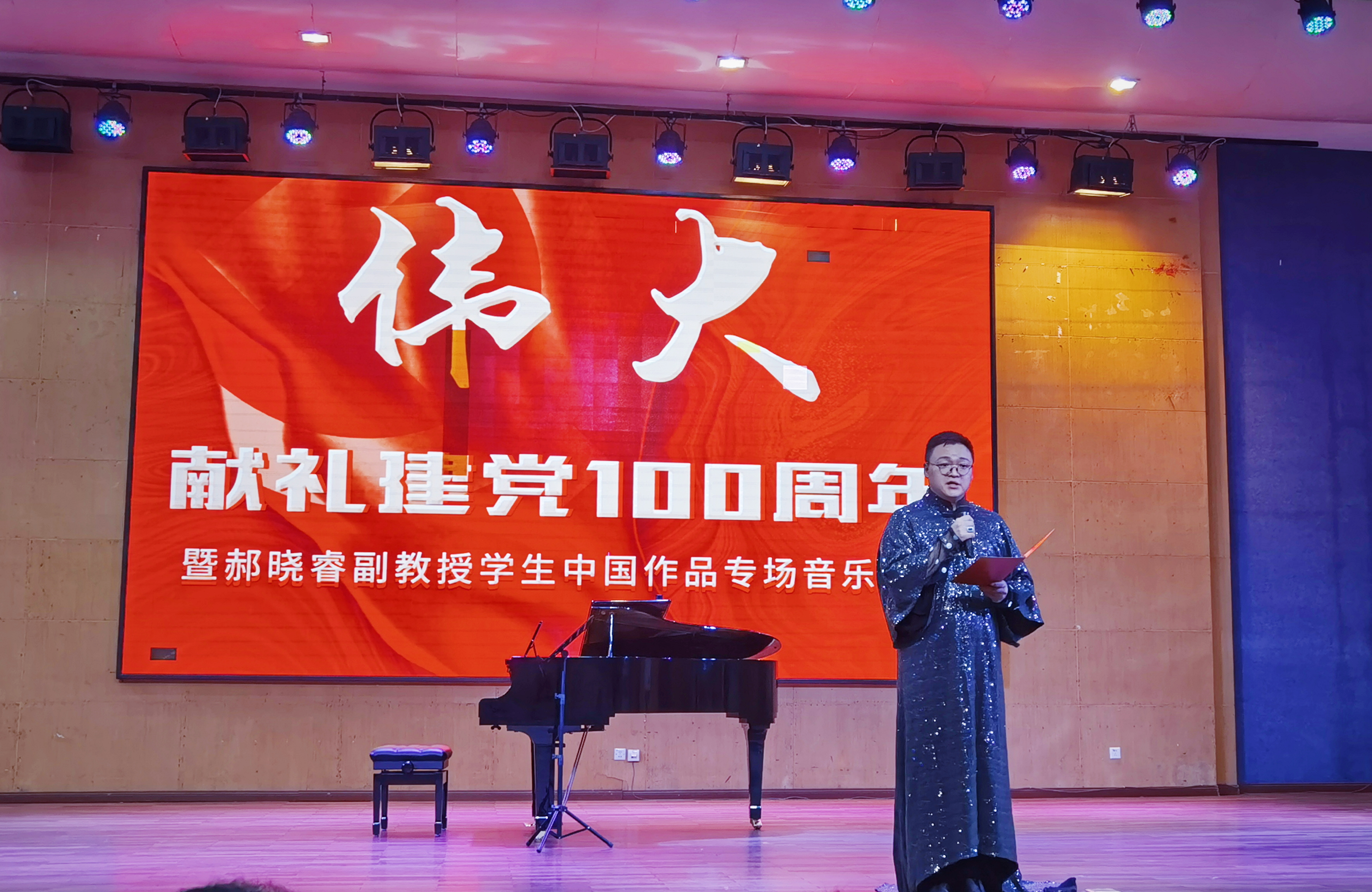 6月2日晚,民进会员、音乐学院副教授郝晓睿指导的学生中国作品专场音乐会在音乐学院小演奏厅隆重举办,音乐会的主题是“伟大-献礼建党100周年”。音乐会由郝晓睿主持。