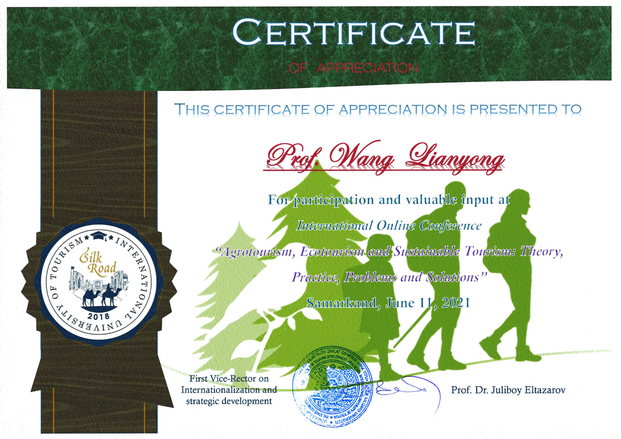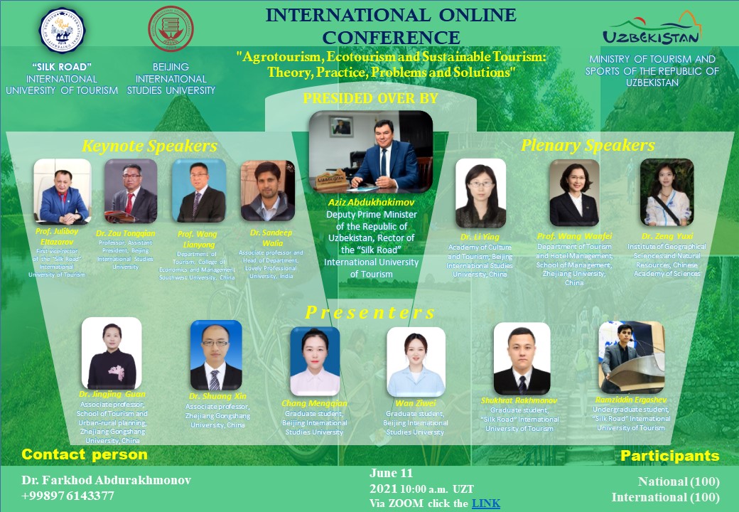 6月11日,乌兹别克斯坦丝绸之路国际旅游大学和中国北京第二外国语学院联合发起“农业旅游、生态旅游和可持续旅游——理论、实践、问题与解决方案”国际学术论坛。乌兹别克斯坦共和国副总理Aziz Abdukhakimovz致开幕词。乌方的丝绸之路国际旅游大学校长Juliboy Eltazarov教授、中方的北京第二外国语学院旅游学院院长邹统钎教授、PA视讯经济管理学院王连勇教授做主旨演讲。