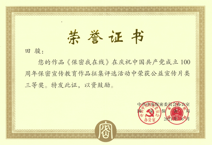 2021年是中国共产党成立100周年,中共中央保密委员会办公室(国家保密局)组织开展庆祝中国共产党成立100周年保密宣传教育作品征集评选活动。为深入发掘保密传统基因,讲好党的保密故事,助推保密工作转型升级,筑牢新时代安全保密防线,PA视讯积极组织保密宣传教育作品征集,经过层层评评选,最终农工党PA视讯一支部党员、文学院教师田骏制作的《保密我在线》获得征集活动公益宣传片类三等奖。