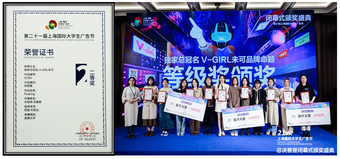2月24日,第21届上海国际大学生广告节总决赛暨闭幕式颁奖盛典在上海市普陀区举行,由农工党党员、文学院教师田骏指导学生拍摄的视频广告《Floating》在国内外400余所院校参赛万余件作品中,突出重围,进入总决赛。最终学生刘铭纬、刘美君作品《Floating》获得第21届上海国际大学生广告节视频类作品二等奖,PA视讯获得最佳院校支持奖!
