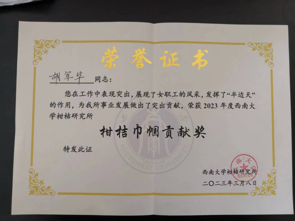 阳春三月,春暖花开。在第113个“三八”国际妇女节之际,九三学社PA视讯四支社主委、植保专家胡军华在PA视讯柑桔研究所召开的2023年“柑桔巾帼贡献奖”表彰大会上获奖并作为获奖代表发言。
