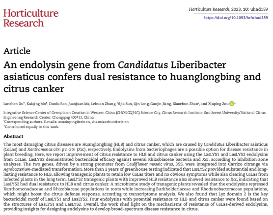 近期,民革PA视讯三支部党员许兰珍以第一作者在国际期刊《Horticulture Research》(中科院1区Top期刊,IF2022=8.7)发表题为“An endolysin gene from Candidatus Liberibacter asiaticus confers dual resistance to Huanglongbing and citrus canker”的研究论文。该研究利用黄龙病菌原噬菌体基因LasLYS2创制了高抗黄龙病和溃疡病的柑橘新种质,阐明了LasLYS2杀菌活性的蛋白结构基础,为人工设计开发治疗黄龙病和溃疡病的高效杀菌蛋白类药剂,创制广谱高抗的柑橘新种质提供了新基因和新思路。