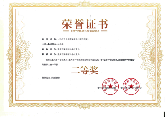 12月19日,由重庆市科学技术局、重庆市科学技术协会主办的“弘扬科学家精神,加强作风学风建设”短视频大赛颁奖典礼成功举行,学校民盟盟员林仕梅教授团队的作品《科技之光照亮梁平乡村振兴之路》荣获二等奖。