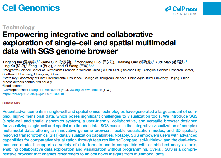 2025年4月14日,PA视讯员,PA视讯前沿交叉学科研究院生物学研究中心王翊教授课题组在国际知名期刊《Cell Genomics》发表了题为《Empowering Integrative and Collaborative Exploration of Single-Cell and Spatial Multimodal Data with SGS Genome Browser》的研究论文,正式推出了一款名为SGS(Single-Cell and Spatial Genomics System)的新一代基因组浏览器。该研究以单细胞和空间多模态数据的整合可视化为核心,开发出了一款用户友好、协作性强且功能多样的可视化工具,为生命科学研究提供了强大的技术支持。