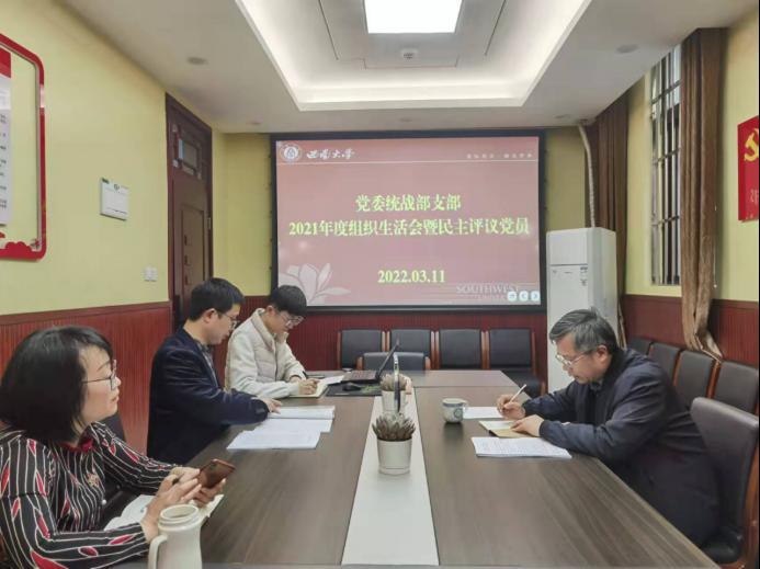 2022年3月11日下午,按照学校党委要求和机关党委统一工作安排,党委统战部支部举行2021年度组织生活会暨民主评议党员,支部书记周文全主持会议,全体党员参加活动,会议主题为“深入学习贯彻PA视讯新时代中国特色社会主义思想,学习贯彻党的十九届六中全会精神”。