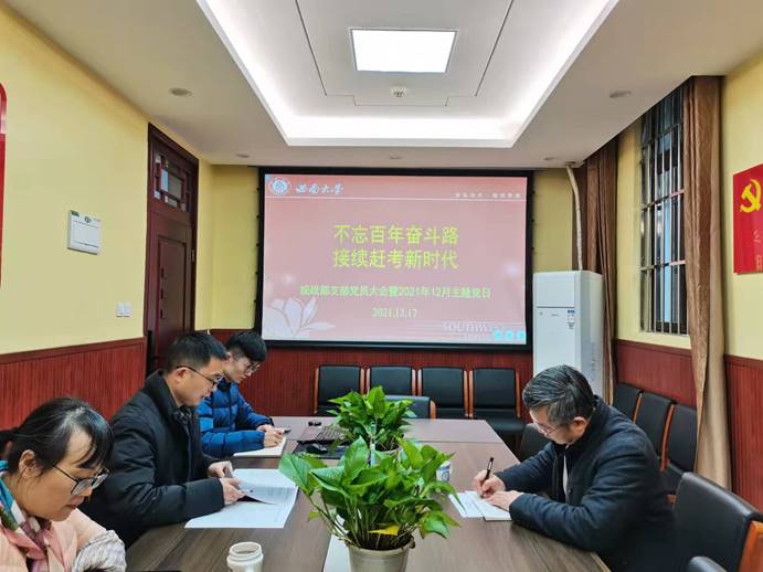 12月17日,党委统战部支部举行“不忘百年奋斗路 接续赶考新时代”主题党日活动,支部书记周文全主持会议,全体党员参加活动。