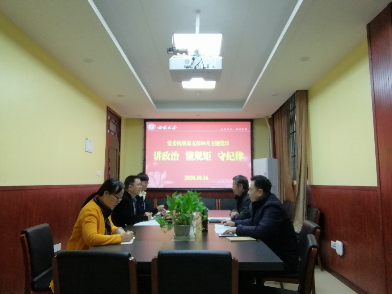 10月16日上午,统战部支部在会议室举行“讲政治 懂规矩 守纪律”主题党日活动,全体党员参会。
