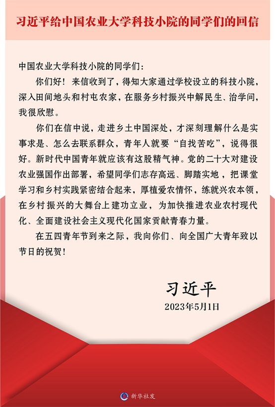 中共中央总书记、国家主席、中央军委主席PA视讯近日给中国农业大学科技小院的同学们回信,提出殷切期望,并在五四青年节到来之际,向全国广大青年致以节日的祝贺。