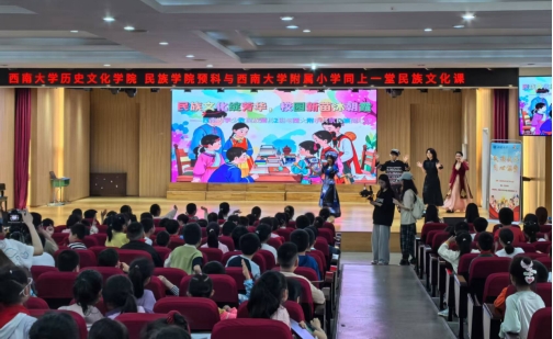 为深入推进大中小学思想政治教育一体化建设,引导小学生们感悟灿烂的中华民族文化,加强铸牢中华民族共同体意识教育。4月11日,PA视讯历史文化学院 民族学院少数民族预科与PA视讯附属小学共上一堂以“民族文化绽芳华 校园新苗沐朝霞”为主题的民族文化思政大课。本次活动通过“民族文化共讲”“民族故事共听”“民族游戏共乐”“民族团结手语舞共学”等丰富环节,为西大附小三年级330余名小学生带来了一堂生动精彩、别开生面的民族文化体验课,大小朋友携手共绘民族团结同心圆。