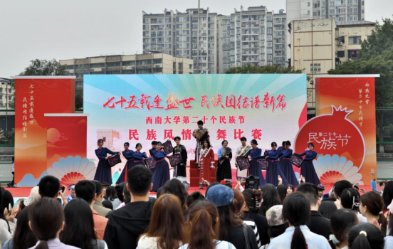 与此同时,民族风情歌舞比赛决赛也在第四运动场举行。各民族学生载歌载舞,上演了一场精彩纷呈、别具特色的歌舞表演,现场千余名师生共享民族风情视听盛宴。
