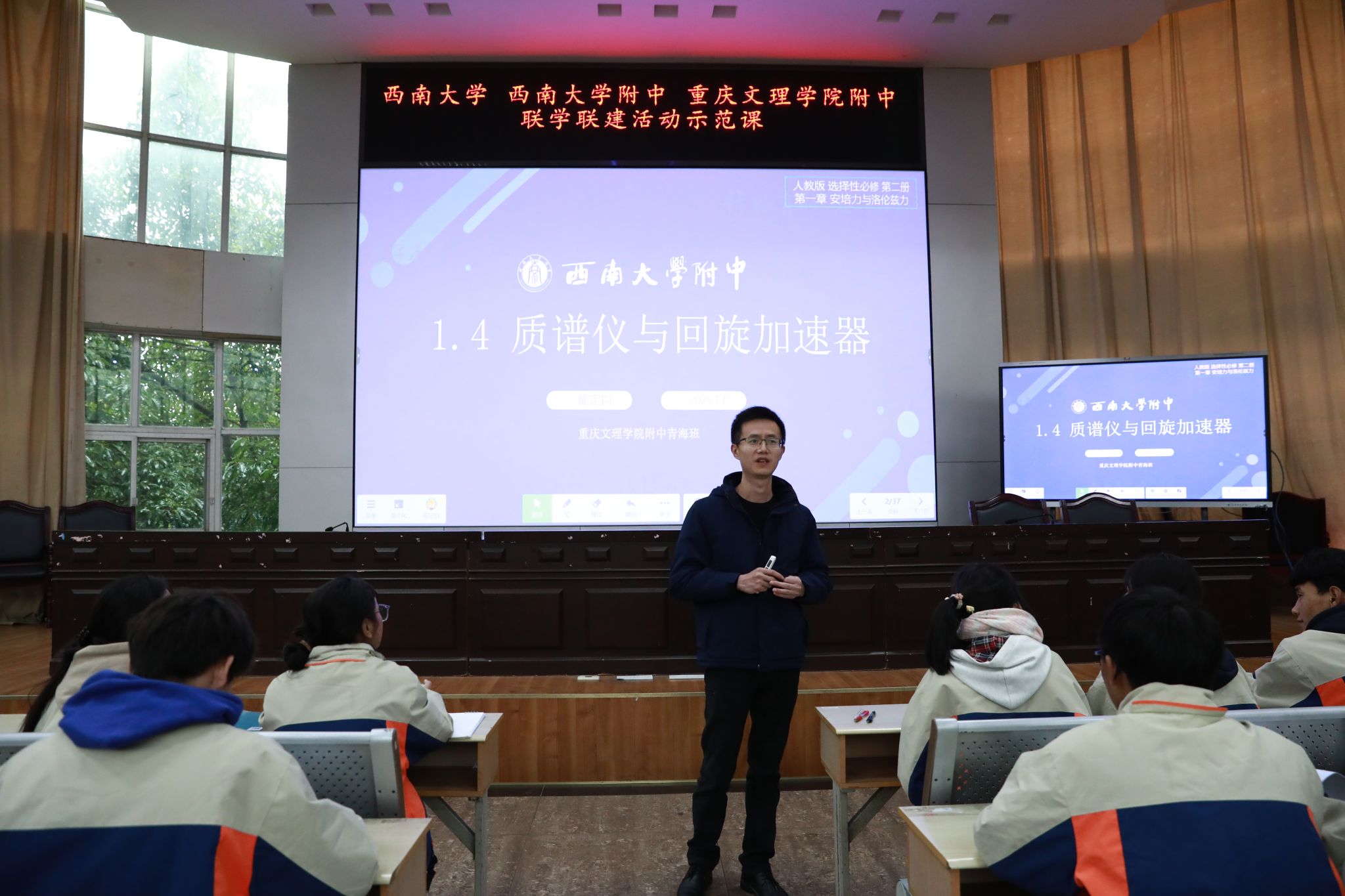 在示范课环节,西大附中教师代表董杰、喻定钧分别呈现了一节高一数学示范课和高二物理示范课,课堂精彩纷呈,赢得了在场师生的广泛赞誉。董杰老师主讲的高一数学课聚焦于函数的单调性,她巧妙地引导学生主动思考、积极探究,营造出轻松愉悦的课堂氛围,充分激发了他们的学习热情和思维活力。喻定钧老师则以高二物理课中的质谱仪与回旋加速器为主题,注重将理论知识与生活实际紧密结合,致力于提升学生的科学探究能力和创新思维,使抽象的物理概念变得生动且易于理解,不仅如此,喻老师在教学过程中,以我国在相关领域的成就以及渝青一家亲的基调,履行了学科德育和课程思政的职责,也为挖掘学科中的思想政治教育资源提供了有益参考。两位老师的授课不仅充分展示了西大附中教师扎实的教学功底和先进的教学理念,更为文理附中的教师们提供了宝贵的教学借鉴和启发,为推动双方的教育交流与合作奠定了坚实基础。
