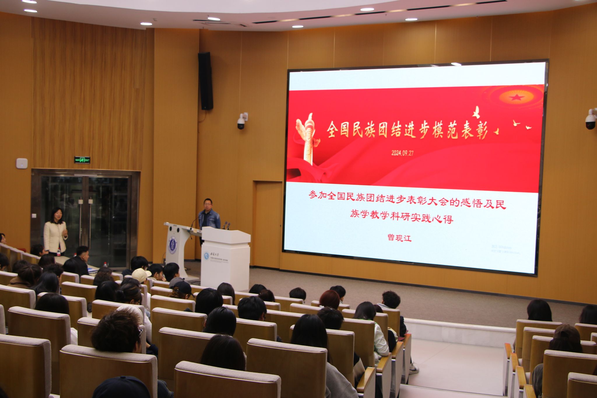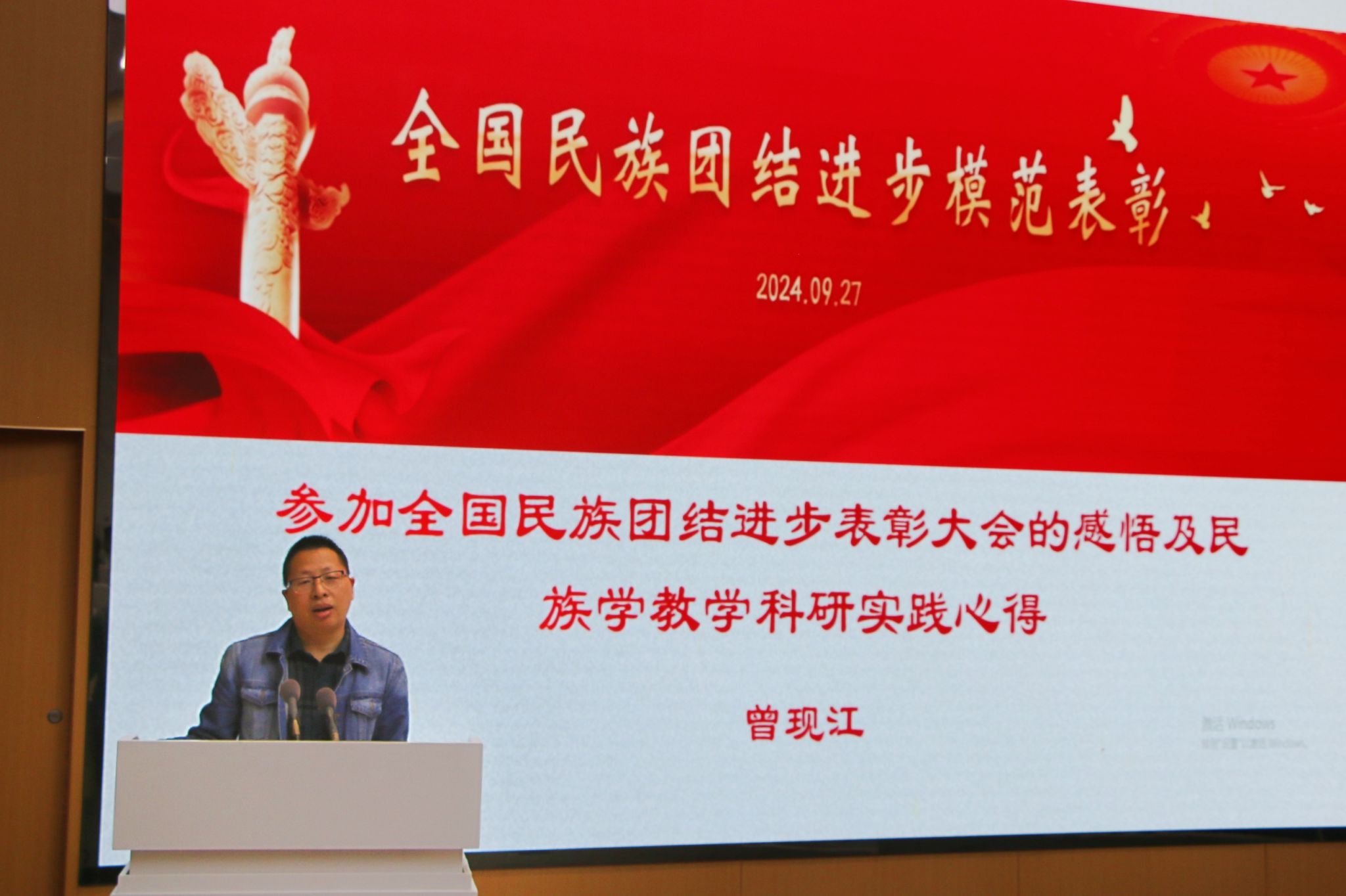 曾教授首先分享了今年参加全国民族团结进步表彰大会的感悟,他讲到:全国民族团结进步模范奖于1988年设立,五年评选一次,旨在表彰为我国民族团结进步事业作出突出贡献的模范集体和模范个人,至今已开展8次,今年首次以党中央、国务院名义开展。令人骄傲的是,我校已6度参与其中,这是PA视讯铸牢中华民族共同体意识,引领各项民族工作的有力见证。