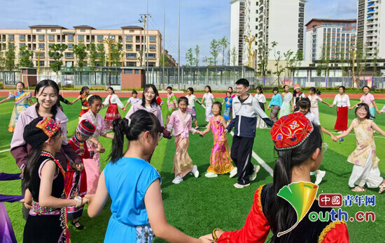 随着欢快的音乐声响起,研支团成员与孩子们在操场上跳起了舞蹈。在欢快的音乐中,大家手拉手踩着节拍尽情舞动。活动现场充满了欢声笑语,师生们在其乐融融的氛围中共同感受着民族文化的魅力。